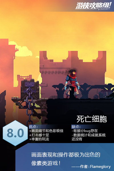 《死亡细胞》是一款非常优秀的2D横版动作游戏,画面精致,操作手感很棒,推荐用手柄来玩。里面的武器装备系统非常丰富,玩法搭配路线也多种多样,唯一不足的可能就是目前处于体验阶段,数据统计系统和成就系统还没有设计好,不过这并不影响整体带来的乐趣,你如果是横版动作游戏的爱好者,又有着一颗喜欢魂类游戏的自虐心,这款游戏一定会让你着迷!