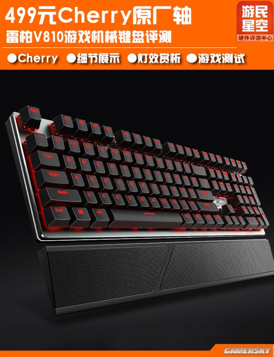雷柏V810游戏机械键盘采用广受玩家追捧的德国Cherry MX原厂轴体,搭配霸气的红色背光,下面笔者就与大家一起近距离感受一下雷柏V810的魅力。