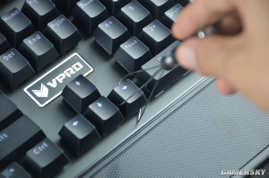 雷柏V810的配件还有一个VPRO专属的金属拔键器,底部手握部分有VPRO的LOGO。