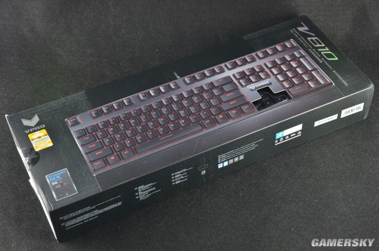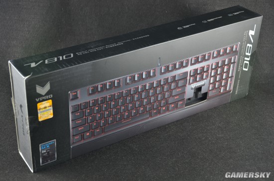 雷柏V810游戏机械键盘在包装上采用整体黑色,正面有着泛着红光的键盘缩略图,右上角V810标识了本款键盘的身份。