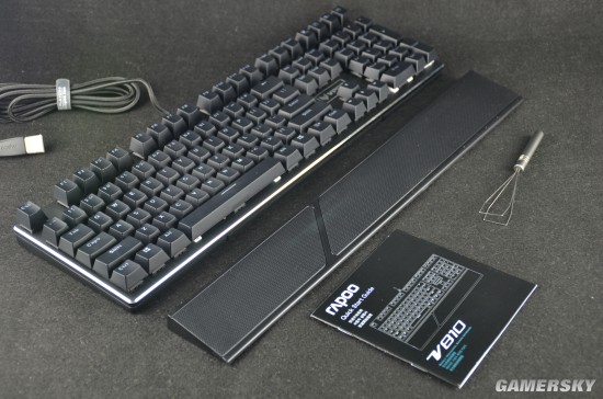 雷柏V810游戏机械键盘采用全尺寸104键+4功能键设计,在USB接口下可以实现全键无冲。