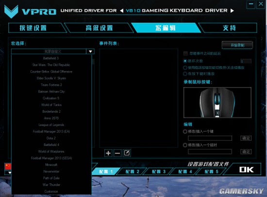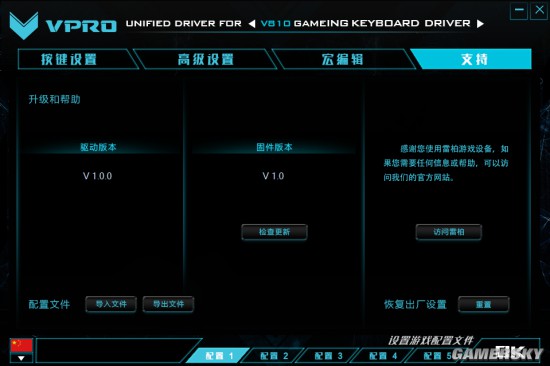 雷柏V810游戏机械键盘采用板载内存,全键(功能按键以外104全键)可以通过配套驱动软件进行编程,内置Flash存储器,总共可以保存5组配置。