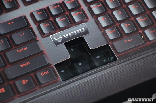 右上角四个功能按键,从左至右依次是VPRO按键(背光调节),静音键,Win锁定键和模式切换键。