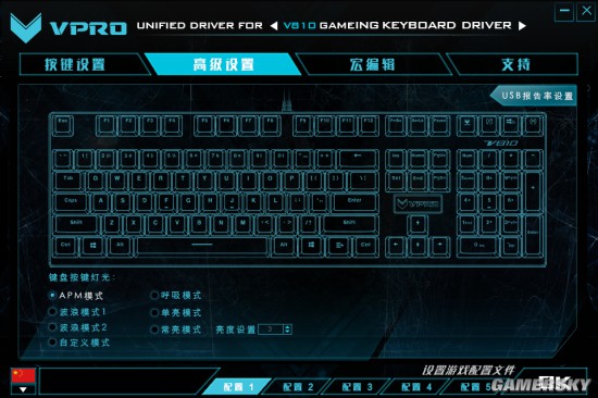在高级设置中,可以切换按键灯光模式:APM模式、波浪模式1、波浪模式2等,在常亮模式中能够切换亮度,共有3档可选。自定义模式中可以单独设定每个按键的是否发光。右上角可以调节USB报告率。