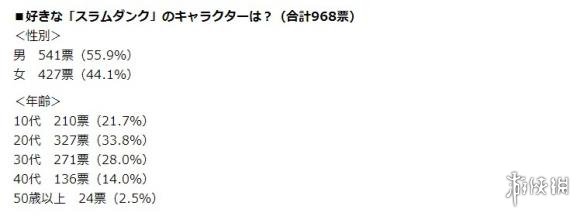 根据介绍,本次投票人数共计968人,其中男性受访者贡献541票(占比55.9%),女性受访者贡献427票(占比44.1%)。此外,调查者还将受访者按照年龄划分为不同阶段,据此统计《灌篮高手》对不同世代群体受众的影响。而从最终结果来看,拔得头筹的明星球员果然是他。