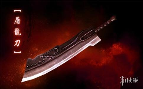 由杨过的玄铁重剑混合西方精金铸造,刀中藏有岳飞兵法《武穆遗书》,此刀有百余斤重,锋利无比,气势霸道,强力磁性能吸天下暗器。江湖流传武林至尊,宝刀屠龙,号令天下,莫敢不从,倚天不出,谁与争锋。