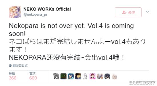 官方推特用中、英、日三国语言发表声明;“NEKOPARA还没有完结~会出vol.4哦!”