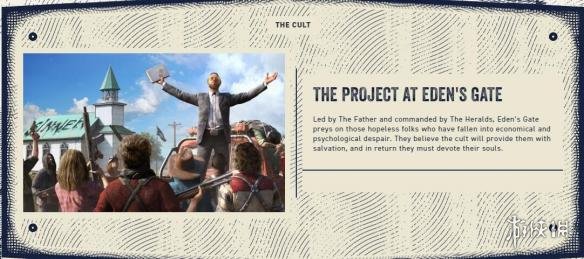 首先是关于本作中的邪教组织,根据官网的介绍该组织名为“伊甸之门计划”(THE PROJECT AT EDEN'S GATE),他们相信大崩溃(The Collapse)已经近在眼前,只有他们无情又独断的领袖“父”(The Father,本名Joseph Seed)才能拯救他们。