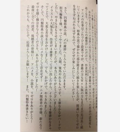 之从截图上可以看到,作者表示如果没有动画的话,就不存在碟片附赠的特典小说了。因此他对动画相关人员能够给自己一个写《从零开始》新故事的机会表示感谢。并且对所有支持动画跟小说版《从零开始》的粉丝们也表示感谢。他希望大家今后多多指教,并且还想继续写特典小说。