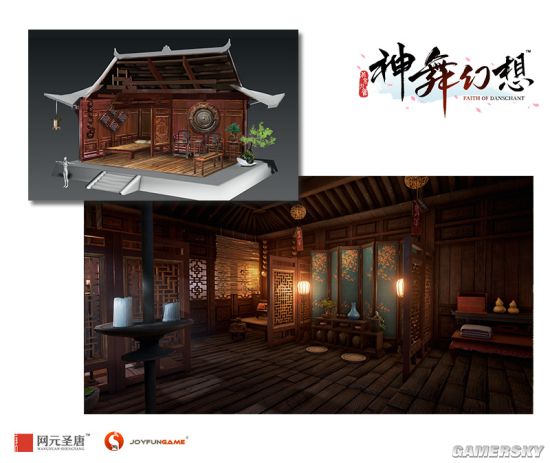 《神舞幻想》的原画设计工作需要参考文物和史料去还原出当时的人和建筑等的形貌、结构和质感,最后透过3D设计进行微调来确定《神舞幻想》独有的美术风格。在建筑方面,《神舞幻想》采用了大量斗拱、藻井等古建筑元素,美术组特意请建筑大师来教授斗拱工艺,以便能在3D中完美还原这些古老建筑的精妙所在。在Gary看来,《神舞幻想》制作过程中最费心力的,莫过于设计这些古老建筑集中的城镇。从2D到3D,地图范围或许不大,但却需要耗费比野外场景更多时间和精力去讲求陈列、光线、结构等等。这也是Gary最期待玩家关注到的细节,希望大家在日后的游戏体验中可以停下脚步,欣赏一下由美术组成员们精心打造的建筑场景。