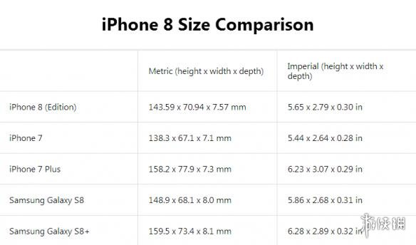 据iDrop News的报道称,他们收到的iPhone 8准确三围是143.59×70.94×7.57mm,作为对比,iPhone 7和iPhone 7 Plus的长和宽分别是138.3×67.1、158.2×77.9mm,而三星S8的体积是148.9×68.1×8.0。
