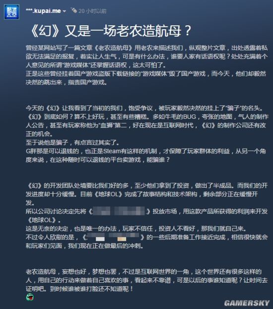 而就在今天,曾经打造《地球OL》的制作组居然来到了《幻》的社区,发表了名为《〈 幻〉又是一场老农造航母?》的文章。文中他们对《幻》的境遇表示心疼,还称今天的《幻》让他们看到了当初的自己。