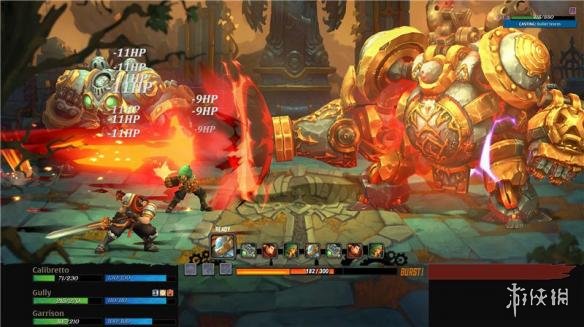 游戏的战斗系统就和看上去一样有趣,玩家要从6名Battle Chasers中选出3名登场战斗,每名角色都有着独有的能力。战斗中每名角色都能从快速攻击,技能和拥有特写演出镜头的爆发攻击(Burst Attack)中选择一种发动,但后两种能力需要玩家进行一回合蓄力才能使用。游戏中的敌人同样可以发动快速攻击与技能,而boss敌人更是有着自己独特的爆发攻击。
