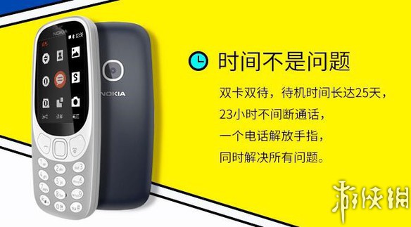 复刻版颜值也更简洁明快,设计更轻薄圆润,有黄色、灰色和深蓝色可供选择,防水键盘,T9键盘配合诺基亚输入法,可实现单手盲打,另外也支持双卡双待,FM广播以及MPS3播放器等功能。