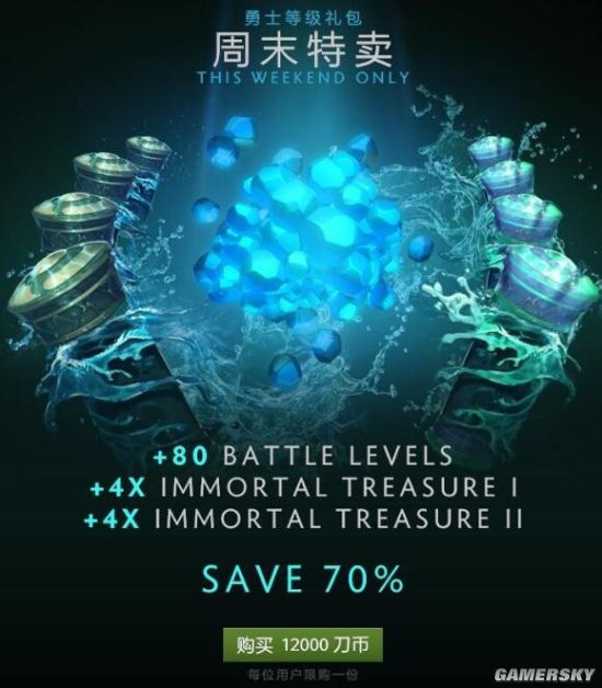 《Dota2》周末特卖-勇士等级礼包推出:售价19.99美刀(12000刀币),送送80级小本子等级、4个不朽1珍藏、4个不朽2珍藏,限购一次。