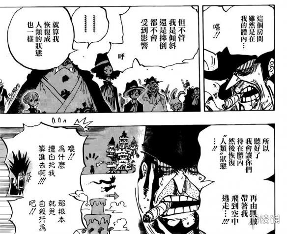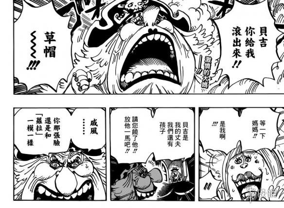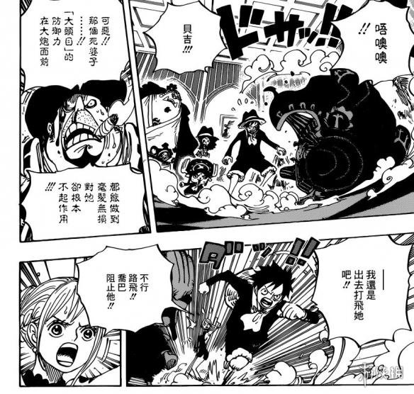 《海贼王》漫画870话汉化版来了,大妈清醒之后面对被破坏的婚礼现场和自己被暗杀的计划,非常的愤怒,她打算杀掉贝基一伙和路飞他们所有人。贝基变身的城堡受到大妈的激烈攻击,很快就要坚持不住了,贝基打算变回人类的身体,让凯撒带着他们飞离现场。这时候伽治带着杰尔马66登场,为大家殿后。