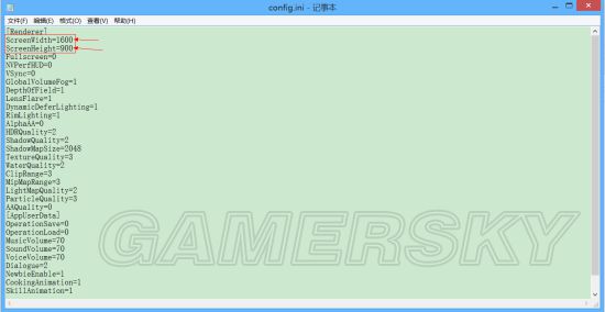 用记事本的方式打开config.ini文件,在红框处输入自己想要的分辨率即可,比如我的是1600X900。