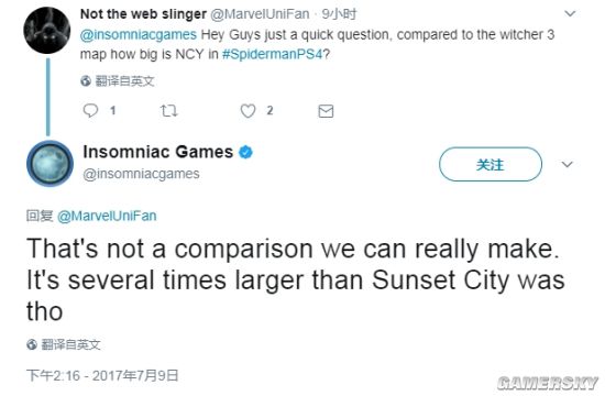 有人在推特上向Insomniac Games询问:《蜘蛛侠》的地图与《巫师3》的地图相比谁更大啊?而制作组对回应称:“这实在不好比较。”不过他们给出了与另一款游戏对比的答案,那就是他们之前开发过的《日落过载》,而他们表示《蜘蛛侠》游戏的地图规模会是后者的“几倍”大。