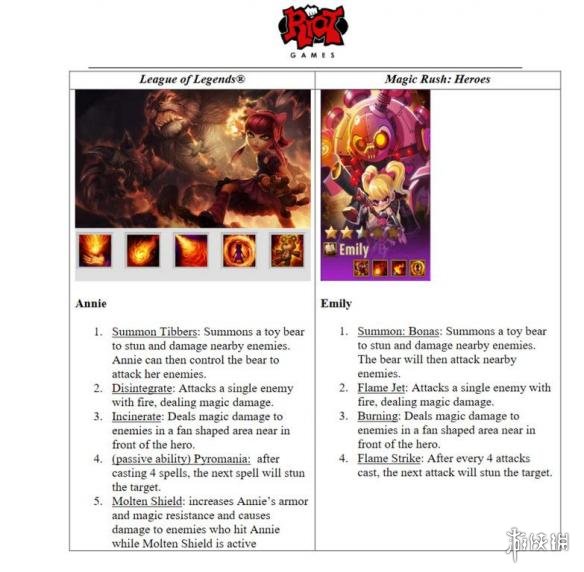 拳头于诉状中指称《魔法热潮:英雄》艾米丽造型、技能抄袭《英雄联盟》安妮。