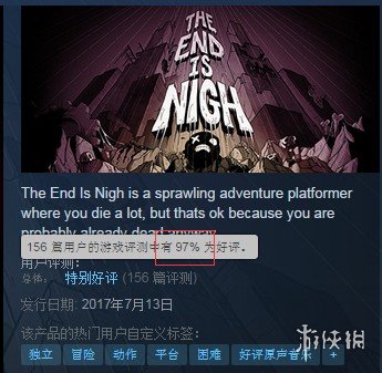 截至发稿前,《终结将至》在Steam上已经有了156名用户给出了评测,好评率97%——特别好评,喜欢的玩家认为《终结将至》的抖M级难度玩起来很爽,关卡设计、操作方面都不错,硬核依旧,极富挑战性,音乐、幽默性、死去活来的难度都是满分水准。