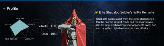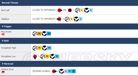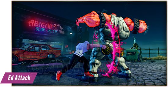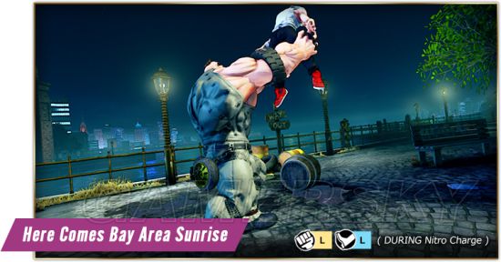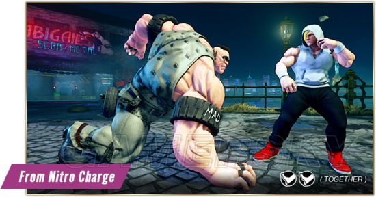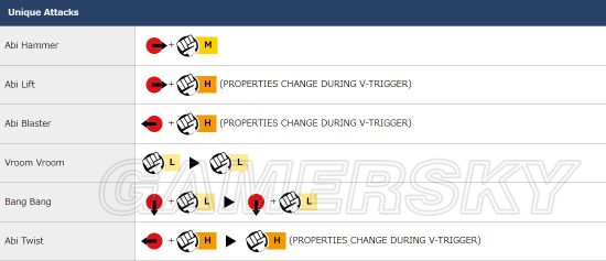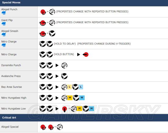 以下为阿比盖尔出招表,其中有两个指令投招式,但事实上,他的核心技能是狂战士冲刺(Nitro Charge Run,同时按两个脚)。这个必杀技有一发刚体,EX版有两发,以及多种派生。可以打、指令投、中段、VS,利用这招能打出有趣的择。