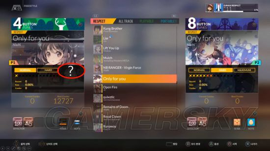 由图可见1P、2P选择的是同一首歌,但因模式不同,可选难度以及难度等级也不同