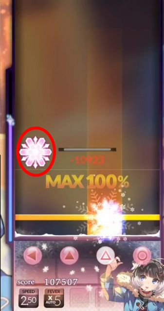 红圈标记处为NOTE,不同NOTE有不同的图案。可在歌曲选择界面对NOTE进行选择装备