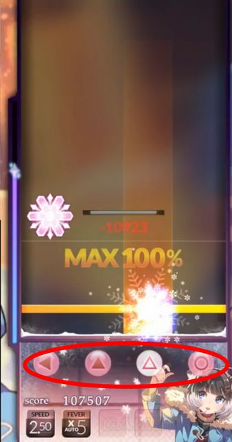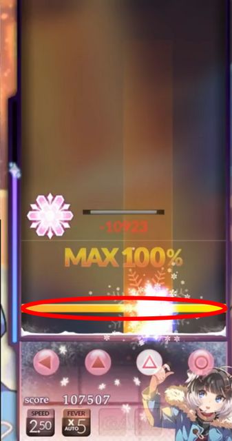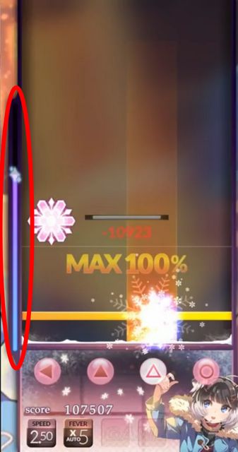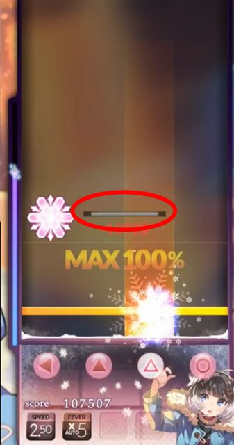 红圈标记处为Fever条,当积攒满后会有一声音效提示,同时会有Fever的字样出现,按X键即可进入Fever爆发。注意,只有判定为100%的NOTE才能对Fever条进行能量积攒