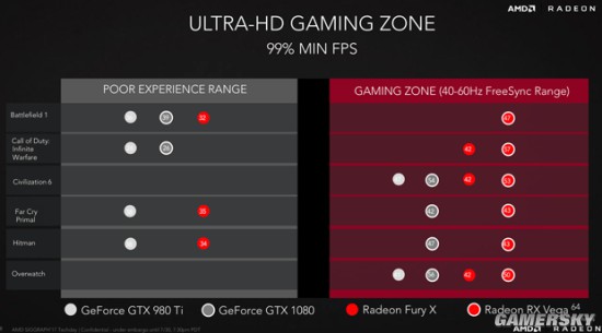 分辨率上到4K,游戏换为《战地1》、《使命召唤13》、《文明6》、《孤岛惊魂:原始杀戮》、《杀手6》、《守望先锋》,Vega 64依然确保99%的最低帧都超过48,而GTX 1080在前两款射击游戏中均不足40。