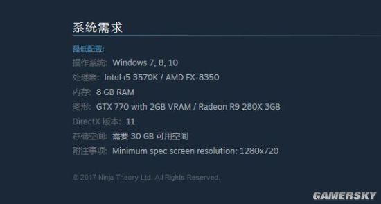 在游戏的Steam页面,已经有了一个最低配置单,Intel i5 3570K/AMD FX-8350的处理器,8GB内存,以及GTX 770 2GB显存/Radeon R9 280X 3GB显存,值得注意的是,这配置是在1280×720分辨率下的最低配置。