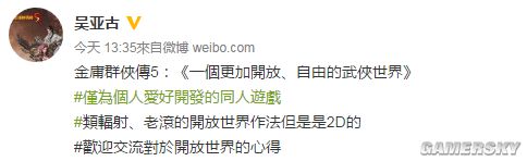 制作人这样描述《金庸群侠传5》:一个更加开放、自由的武侠世界,虽然只是一款同人游戏,但《金庸群侠传5》依然非常受到期待,制作人的工作背景让人相信由他打造的《金庸群侠传5》不会让玩家失望。