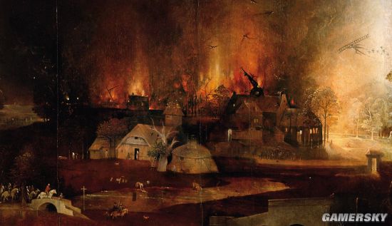 虽然亚楠并没有应用中世纪时流传的对于地狱的定义,不过Hieronymus Bosch所绘制的黑暗风格画作确实与《血源》的艺术风格有一种“亲缘联系”。在他的绘画中我们可以看到淹没于火焰中的村庄,还能看到近乎无光的黑暗地狱中,模糊的建筑物轮廓,以及凶恶的人物造型。是不是很容易就能让你联想到猎杀之夜呢?
