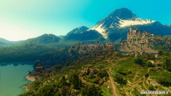 而《巫师3》中诺维格瑞的永恒之火神殿以及鲍克兰宫殿的塑造也有异曲同工之妙,这两处建筑建在山顶,通过周围景观衬托出象征性的主导地位,散发出很强的存在感。这些城市都有着高达的围墙,但是它们从未将城市和自然景观分开,不仅如此,自然景观和城市的空间界限其实相当模糊。这一点就和前文我们提到的版画一样,《巫师3》的城市是逐步过渡到姣区、农村地区最后边际是大布片未经开垦的荒野,从远处看城市就在树木的掩映当中。