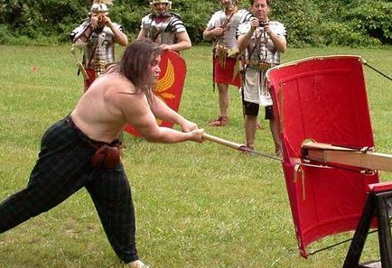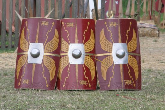 长方形的scutum有利与队友的盾牌重叠。罗马经典阵型“testudo”(拉丁语为“乌龟”)就是基于这种打法。