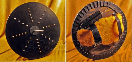 塔奇盾Targe,又叫Target,这个词源于挪威语的targa。(为了方便,本帖的塔奇盾都叫团牌)使用木板,金属和动物皮制作。通常是直径为45-55 cm之间的圆形盾,通常也是平的而不是凸的。团牌Targe比起小圆盾Buckler这种完全无法用作挡箭牌的盾,有了一些挡箭的能力,然而用其挡箭仍然勉强。Targe比Buckler重,所以灵活性上略差。各种Targe握持方法略有不同,有手盾也有臂盾(绝大部分是臂盾)。