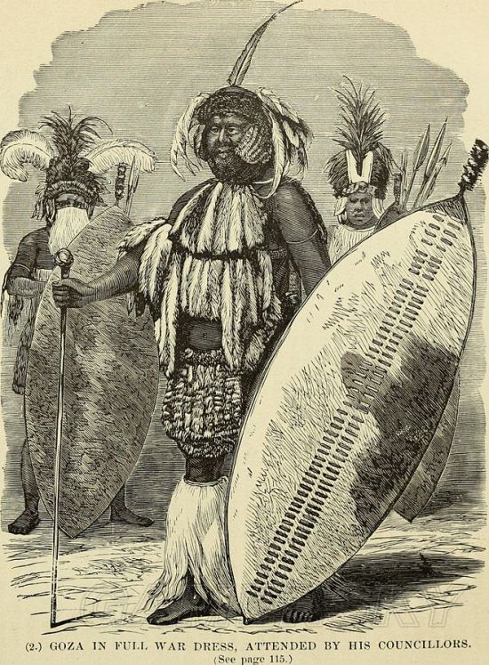 中盾之耻卡萨斯盾,其原型非洲祖鲁族的恩古尼盾。祖鲁盾比起其他先进的盾牌,并没有太大的实战价值。这玩意说白了就是用木棒撑起的兽皮。投矛器投出的矛可以将其轻易刺穿。主要用来表现持有者的地位。如图12-2(约1870年)酋长左臂上的盾牌的大小表示他的身份,白色表示他是一个已婚男子。