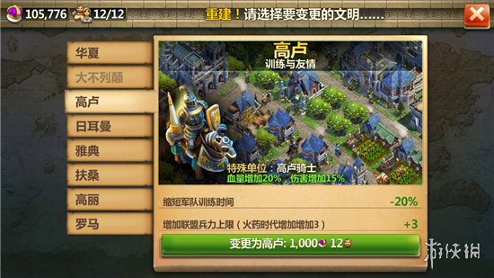 受此历史背景影响,高卢文明有着较之其他文明更快的军队训练速度以及联盟兵力上限。在血量伤害方面有着卓越加成的特殊单位高卢骑士,则是中世纪板甲骑士的最佳代言人。