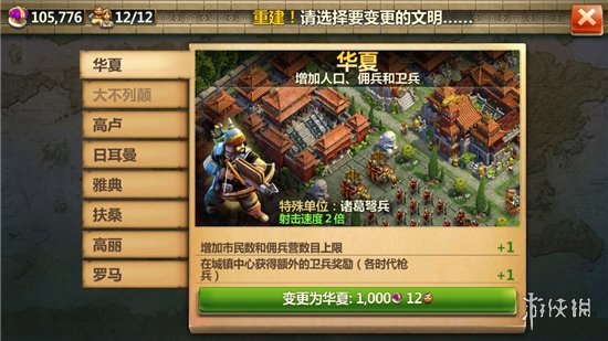 “增加市民数与佣兵营数目上限”的特征,使得华夏文明无论在游戏前期还是游戏后期,都有着其他文明的发展速度;“在城镇中心获得额外的卫兵奖励”,则为华夏文明在发展过程当中提供了强有力的军事保障。知名度极高,脱胎于三国时期蜀国特殊兵种的诸葛弩兵,更是以两倍于其他远程单位射击速度的特效,成为华夏文明的代表单位。