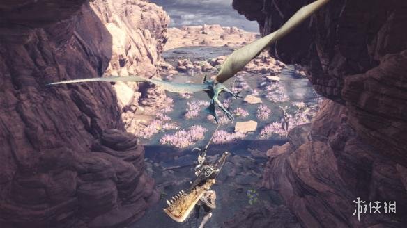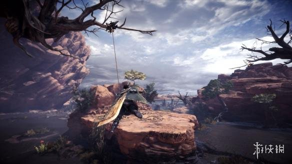 截图主要展示了Wildspire Waste区域,我们能了解到该区域的环境和怪物,玩家可以利用勾索达到很多地方,甚至可以勾在怪物身上“起飞”。图中的远景展示了游戏有着庞大的开放环境。