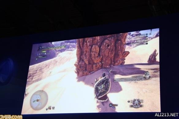 之后开始进行的是追逐逃避和角龙战斗开始向别处移动的土沙龙。装备可以延长滞空时间的特殊斗篷的同时进行持续的战斗后,终于土沙龙开始拖着脚移动起来了。这是怪物虚弱化的提示,“应该是为了休息要回巢穴了吧”辻本良三这样说到。顺便说一下,带有特殊能力斗篷还有很多别的样式,分别区分使用是很重要的。
