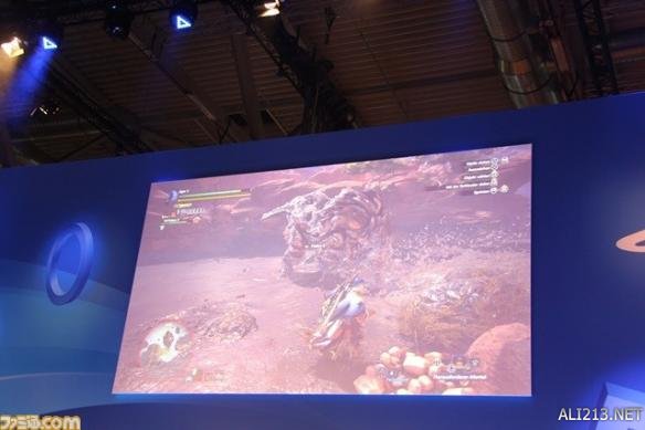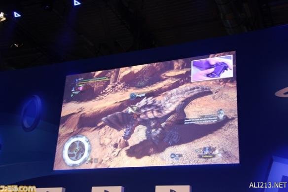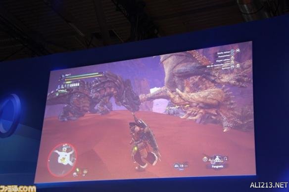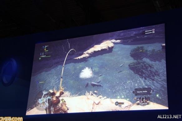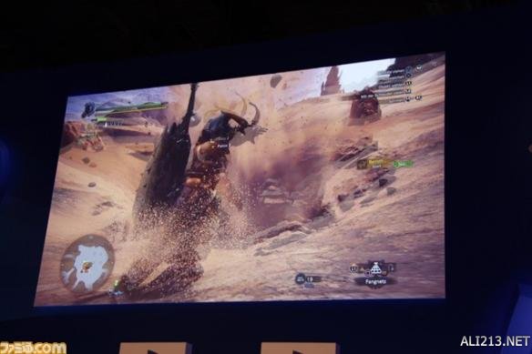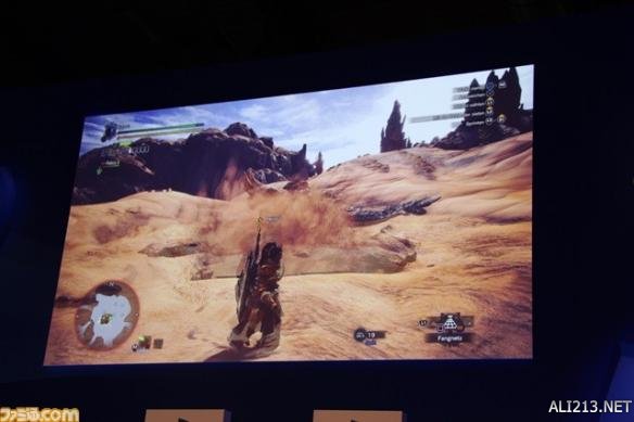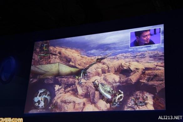 另外,系列惯有的钓鱼系统也进行了展示。在以往的系列里,只能在特定的钓鱼场所里进行钓鱼,但是本作的话在有河的地方基本可以随时钓鱼。紧接着,随着导虫的指引,终于发现了作为目标的怪物“土沙龙”。土沙龙是在《怪物猎人》前几作里出现过的怪物。藤岡要向大家展现出了本作中的“土沙龙”有了怎样的变化。