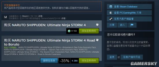 CyberConnect 2制作,万代发行的《火影忍者疾风传:究极忍者风暴4》在上架Steam一年多之后,在今天解锁了国区,国区游戏售价168元。