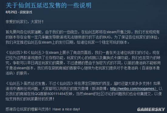 官方在声明中表示,因为发现了现有的版本存在会有一定几率触发导致游戏无法继续进行的下去的BUG,为了保证各位玩家们的体验,决定推迟《仙剑五》在steam上的发行日期。《仙剑四》不受影响,仍将在8月28日发售。