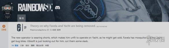 游戏即将引进新干员(特指香港飞虎队的男特勤干员)穿的是一条短裤,这样他就肯定不适合在极地游轮(Yacht)这张地图上执行任务,因为太冷了。而巴西贫民窟(Favela)这张地图蚊子又太多,他可能被“BUG”叮咬。育碧很关心他嘛,所以就这么做喽!