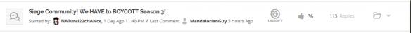 截至发稿,在游戏官方论坛首页点赞和评论最多的帖子就是,号召社区玩家抵制游戏即将到来的第三赛季的。相关帖子表示,育碧在第二年赛季初就移除了之前承诺的波兰赛季,在经过了4个月的健康行动赛季之后,又宣布移除游戏排位赛的多张地图以及非正式对战的两张地图,并且游戏的即将上线的新地图主题公园还不包含在游戏的排位赛地图中。育碧的这些做法实在是无法让人接受。因此他也号召玩家们停止玩家或购买游戏的任何内容抵制游戏即将到来第三赛季,直到官方修改相关的决定。