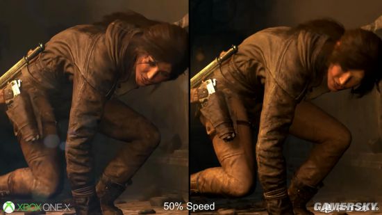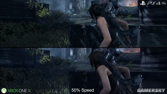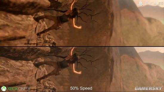 为了更方便比较各种画面细节,DF对两者都采用了50%减速的方式进行观察,最后他们得出结论,X1X版《古墓丽影:崛起》的画面在很多细节上都明显好于PS4 Pro。
