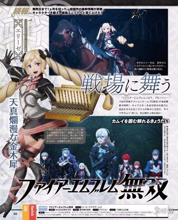 近日,杂志新刊公布了Switch /3DS《火焰纹章无双(Fire Emblem Warriors)》清晰游戏截图!介绍了三名来自《火焰之纹章if》的角色爱丽泽、樱和神威(男),他们都会在本作中登场参战。此外游戏系统方面,系列不少经典的元素都得以再现,预定在9月28日发售。