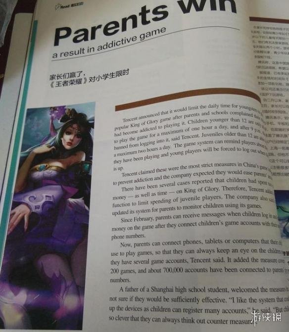 该篇文章内容是以学生沉迷游戏为切入点,介绍腾讯为了控制学生的游戏时间推出的防沉迷系统。另外,小编稍稍介绍这本杂志,《英语街》是一本以中学生的视角来阅读世界的双语杂志,主要讲各个领域的趣事。