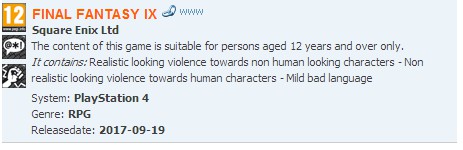 临近TGS,各路游戏爆料接踵而至,欧洲游戏评级组织PEGI曝光了《最终幻想9》PS4版的评级信息,游戏有望在今日下午的索尼发布会上正式公布。