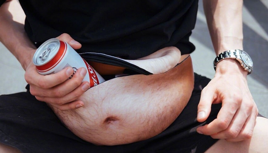 这是国外一个小哥,专为那些吃不胖但梦想有大肚腩的朋友(有这样的人吗)设计的肚腩腰包。